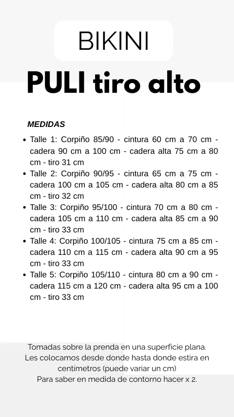 - Talle 5: Corpiño 105/110 - cintura 80 cm a 90 cm - cadera 115 cm a 120 cm - cadera alta 95 cm a 100 cm - tiro 33 cm